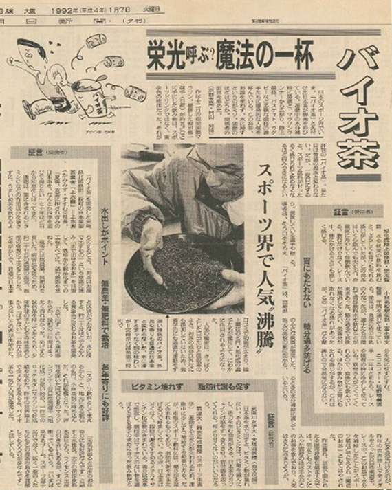 1992年1月の全国紙夕刊にて「栄冠を呼ぶ?魔法の一杯、バイオ茶」という記事が出た時はことさら反響が大きく夕方電話が鳴り始め午後10時頃まで問い合わせと注文が殺到。3日ほどしてそろそろ落ち着いたかと思いきや、数百枚に及ぶ注文ハガキが届き、体が震えました。小さな工場で作ってきたストックではすぐに応じきれないほどの注文だったのです。